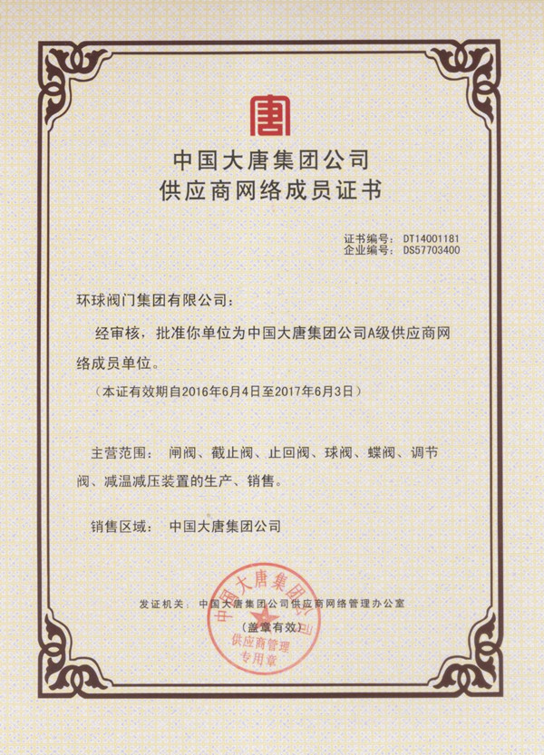 中国大唐集团供应商网络成员证书