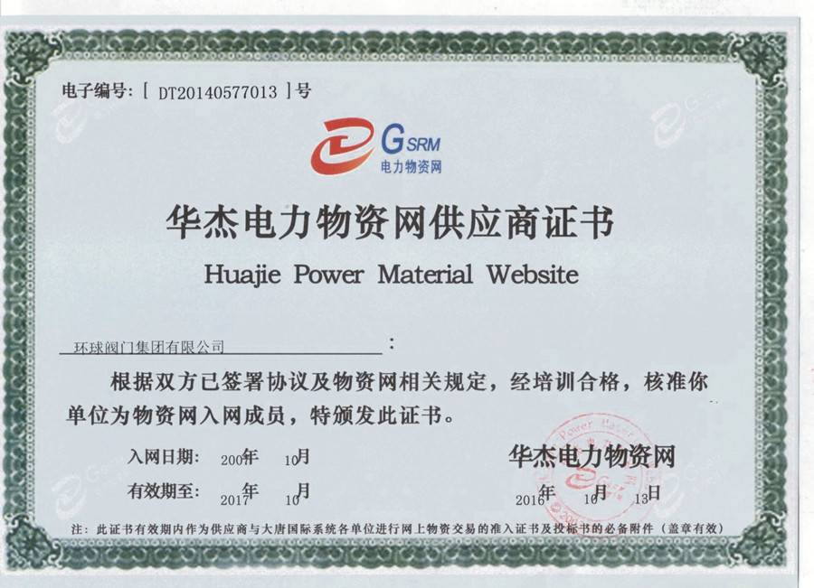 华杰电力物资网供应商证书