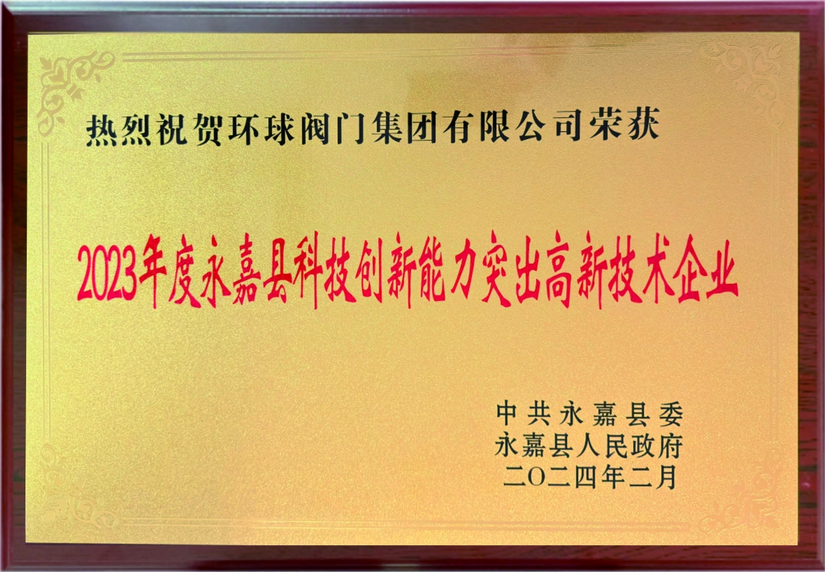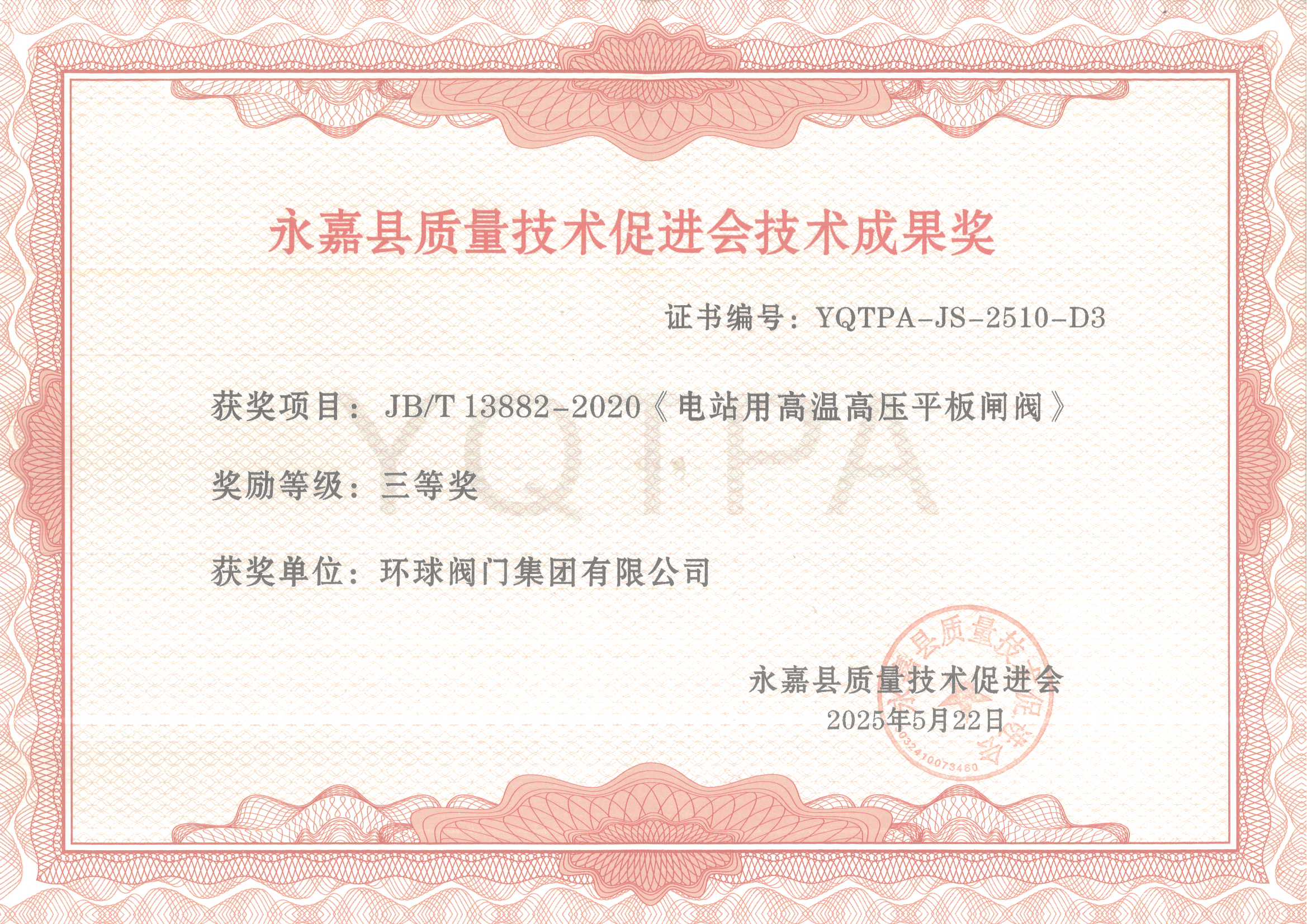永嘉县质量技术促进会三等奖(JBT 13882-2020《电站用高温高压平板闸阀》)
