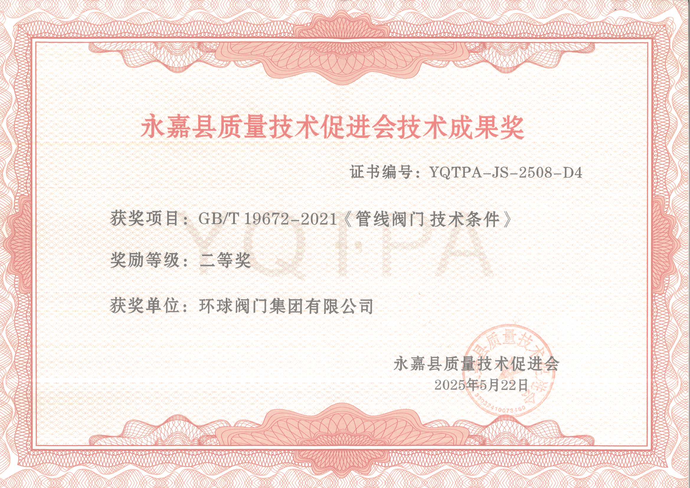 永嘉县质量技术促进会二等奖(GBT 19672-2021《管线阀门技术条件》)