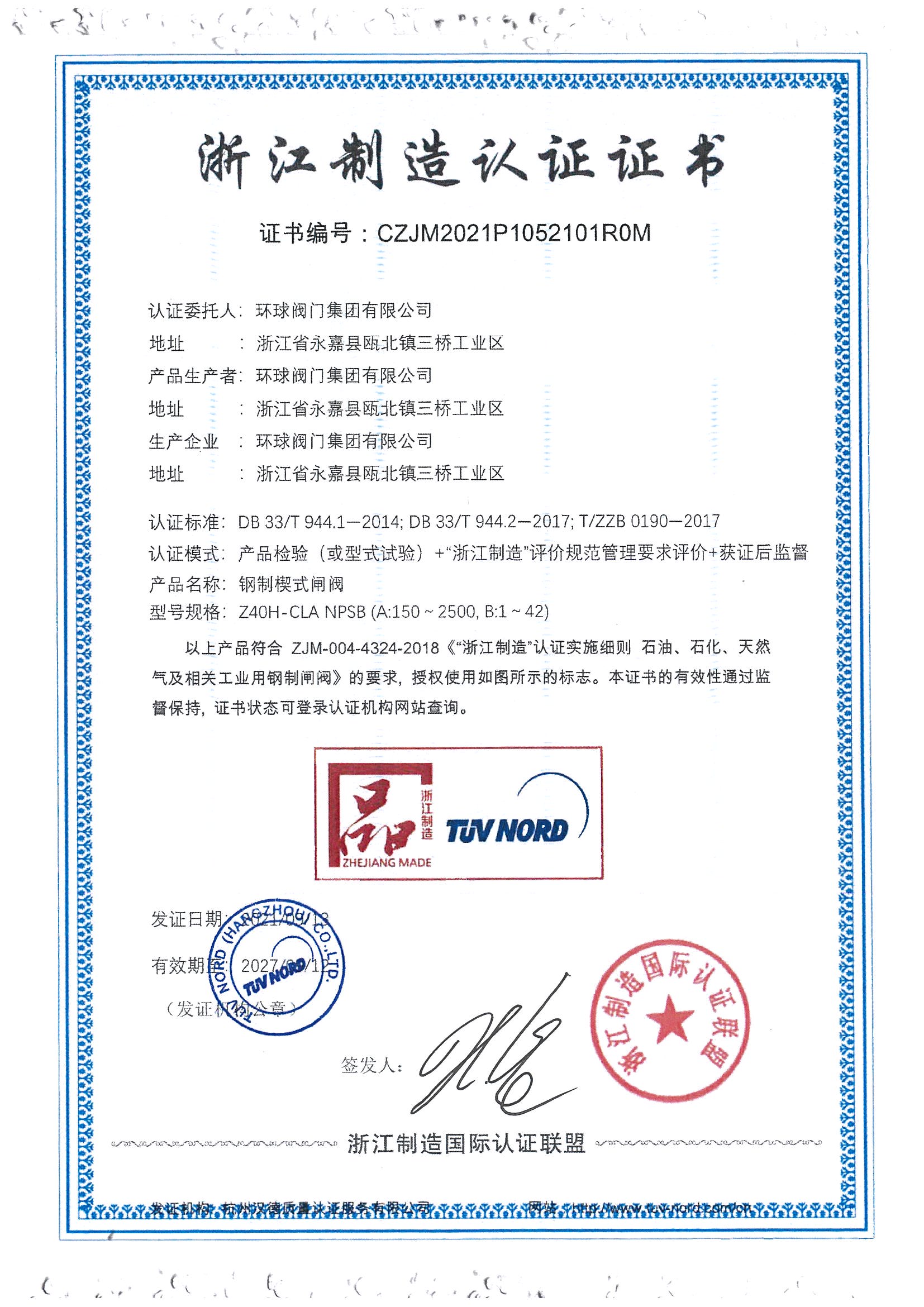 浙江品字标产品TUV认证证书