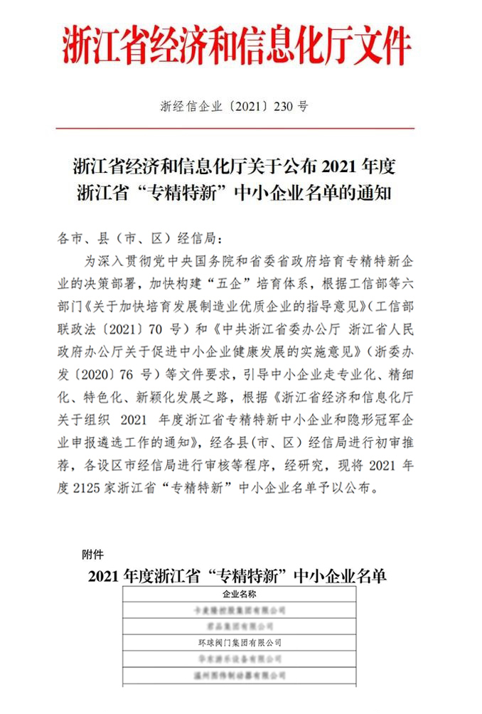 2021年度浙江省“专精特新”企业