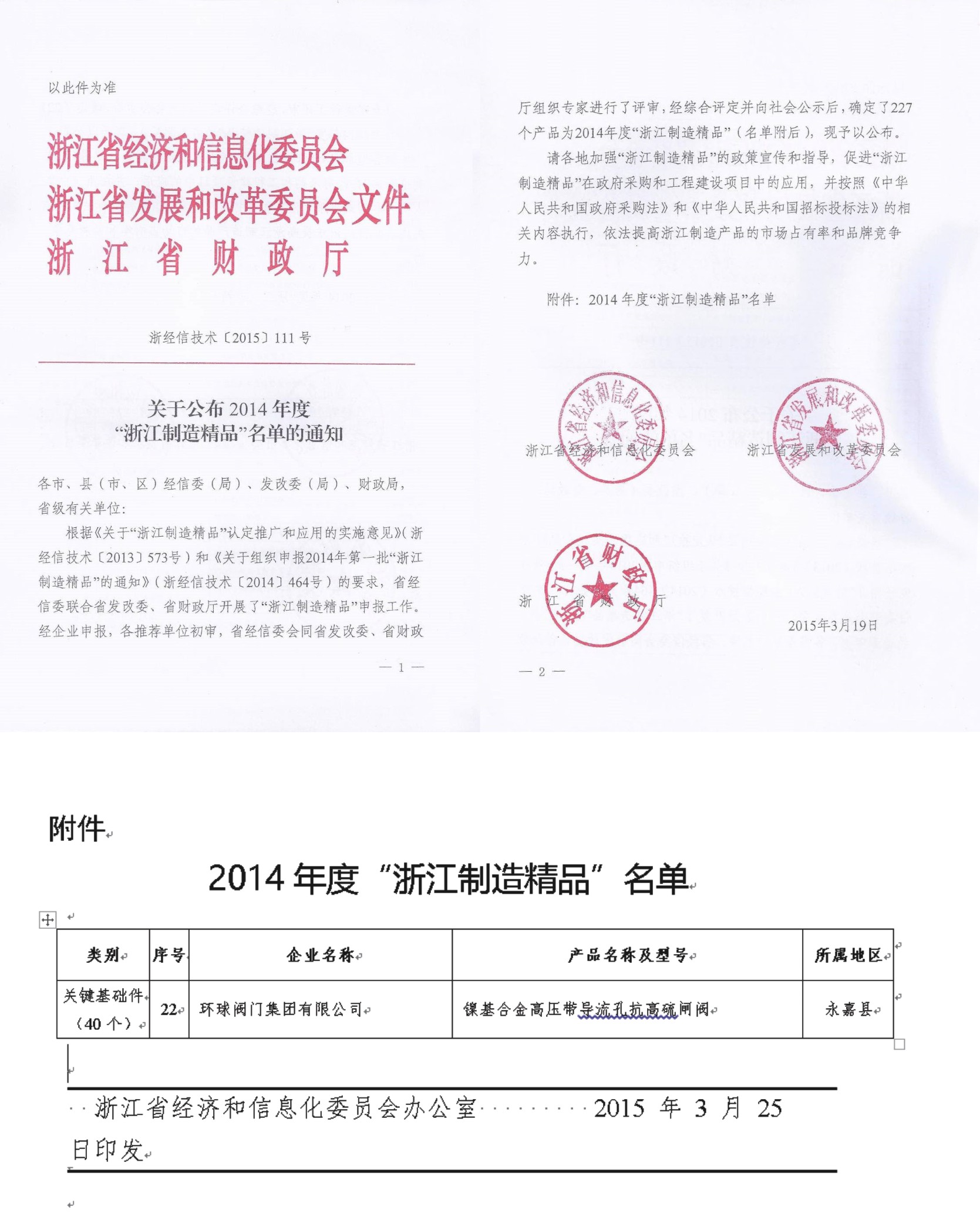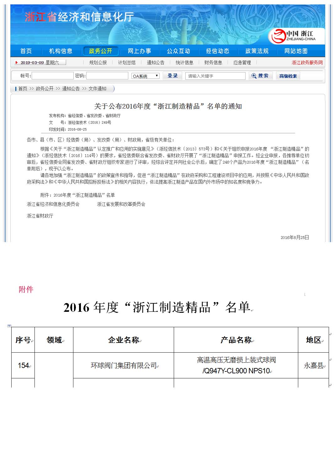 2016年浙江制造精品(高温高压无磨损上装式球阀)